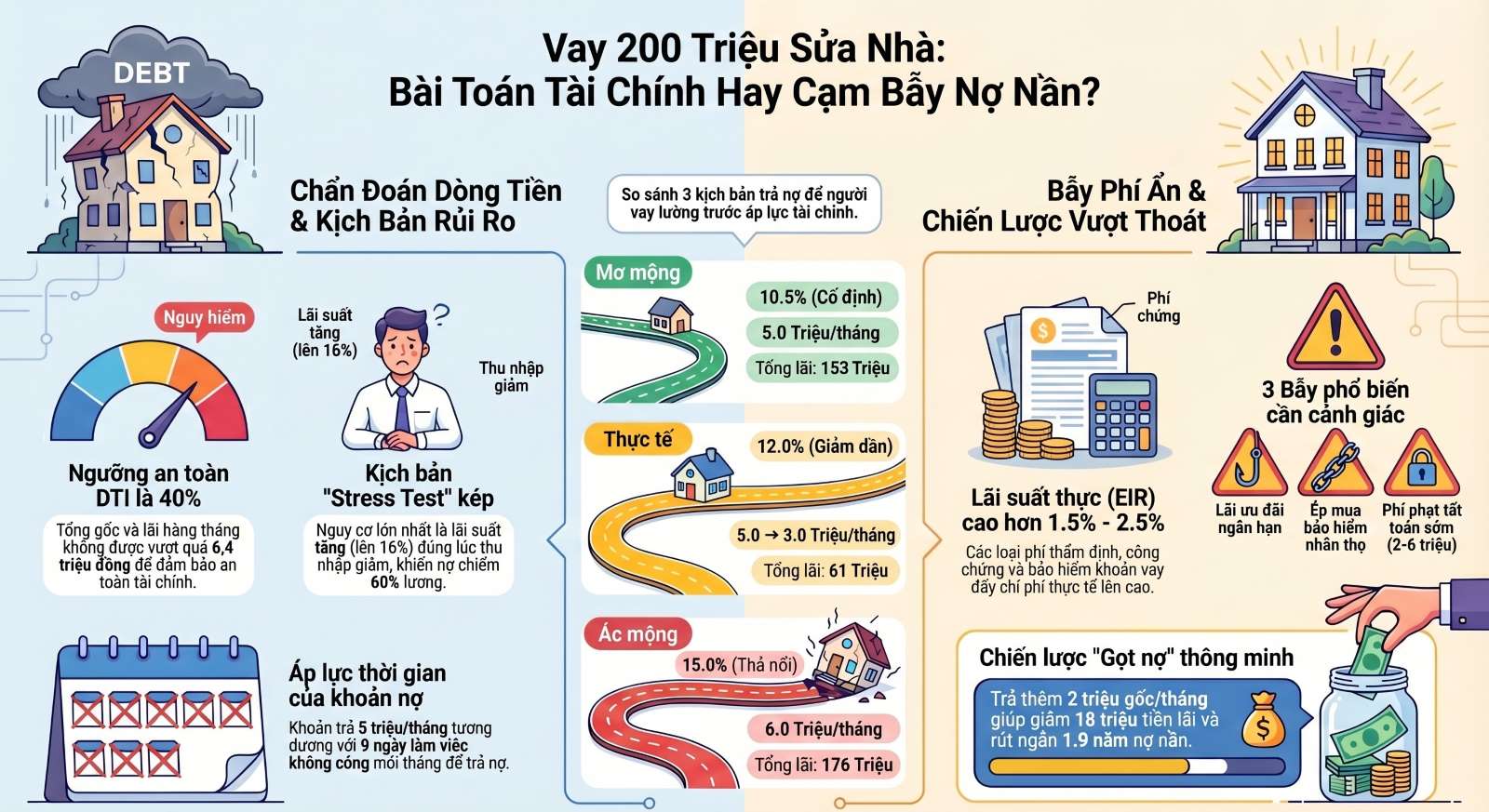 Phân tích toàn diện khoản vay 1 tỷ 15 năm: tổng chi phí 1,64 tỷ, điều kiện thu nhập tối thiểu 32 triệu/tháng và 3 rủi ro cần lường trước.